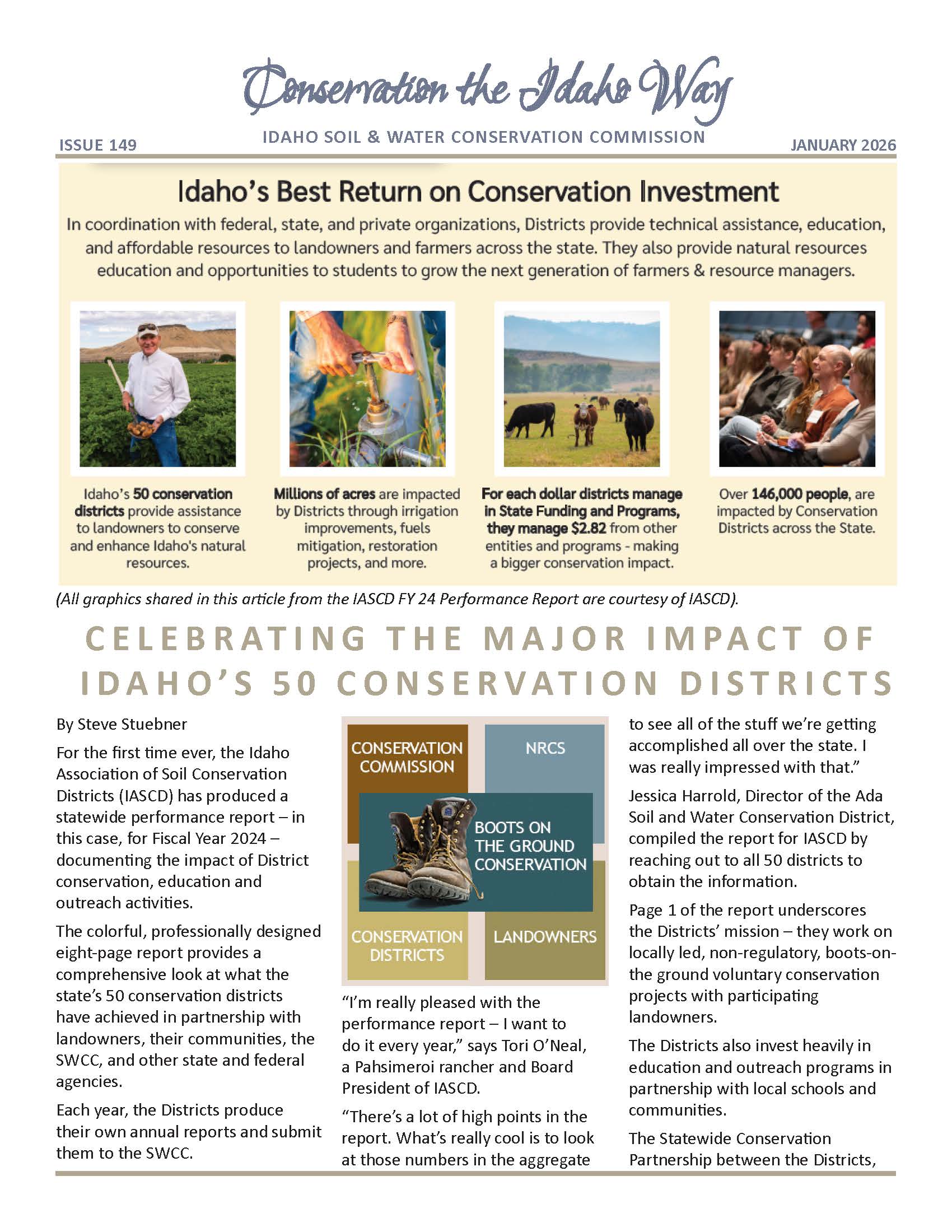 Idaho is home to magnificent and diverse natural landscapes. We have glorious rivers, lakes, mountains, forests and desert canyons and we also have rich and fertile agricultural lands that are well-suited for farming and ranching. Idaho agricultural producers have deep roots in the land. They know that caring for the land benefits both bottom line and future generations. Conservation the Idaho Way encompasses the belief that the very best way to care for and enhance the soil, water, air, plants and wildlife is through voluntary, locally led stewardship.